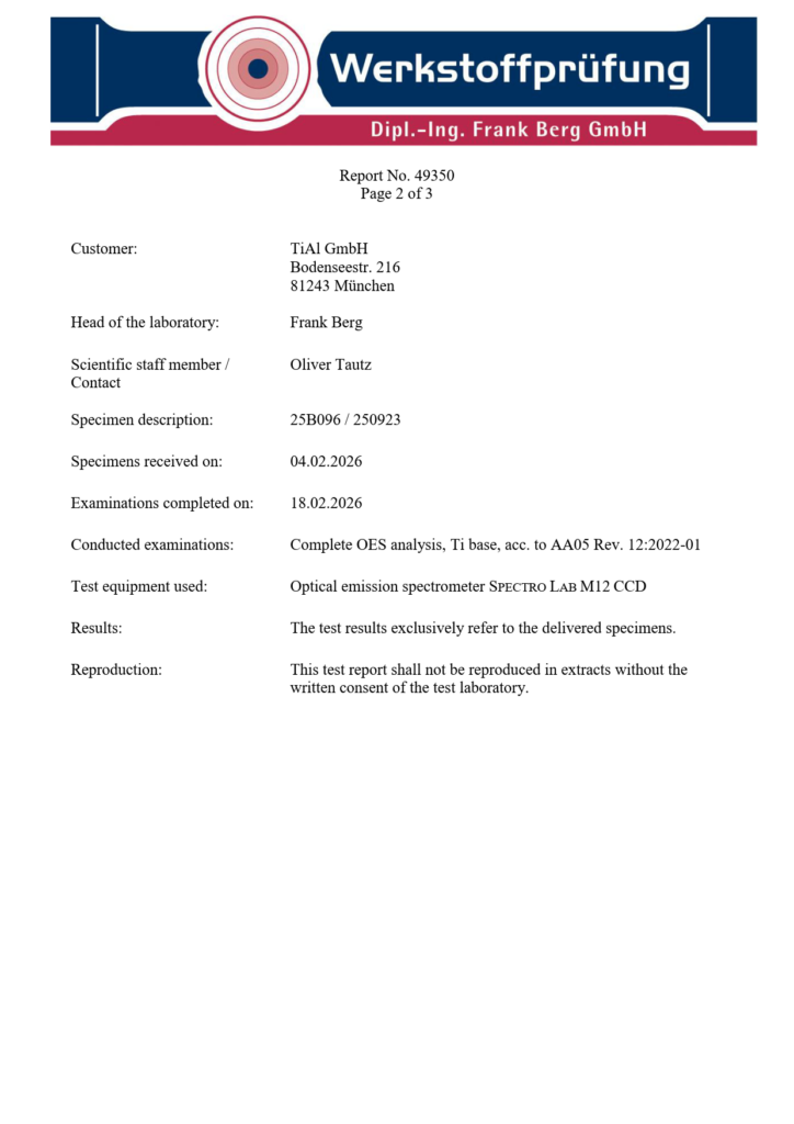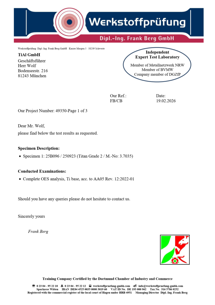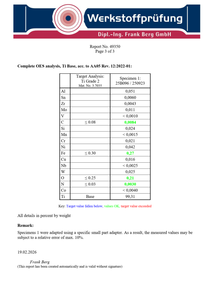 Of course, the informative value of the random samples is limited to the respective tested material and production batch. If you would like a test report for your production batch, please contact us in advance. We will be pleased to provide you with a corresponding offer within the scope of an inspection certificate 3.1 according to EN 10204:2004.